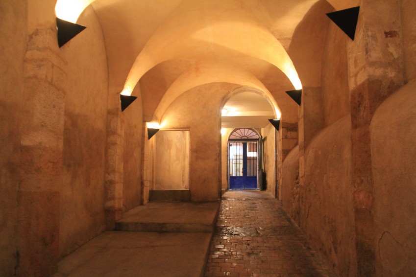 Traboule: passage entre deux rues, souvent accessible par des portes à chaque bout, comme ici.