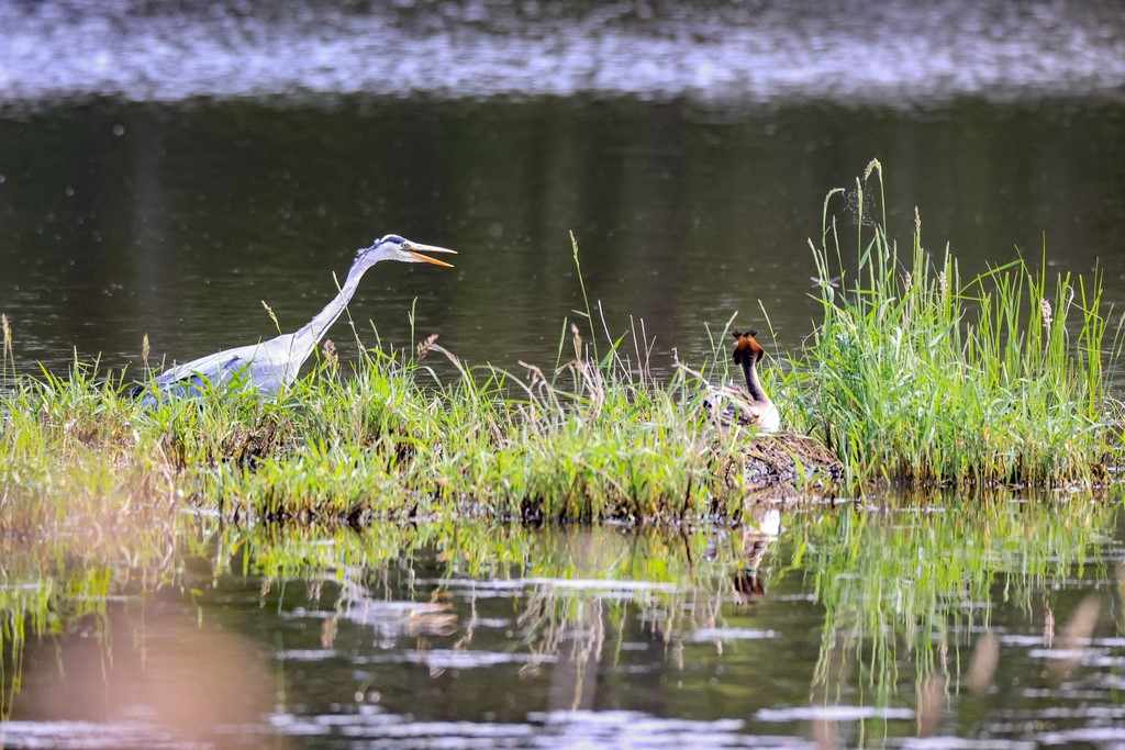 Héron cendré et grèbe au nid